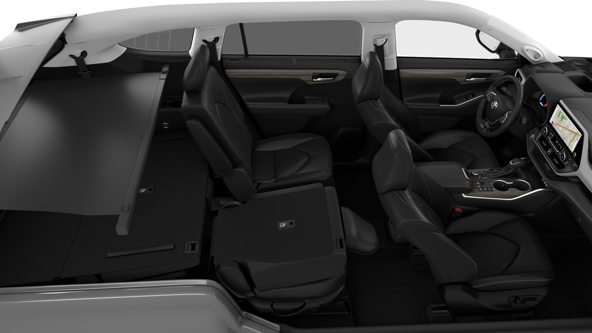 - 7-passenger seating with second-row fold-down captain's chairs and fold-down inboard armrests, adjustable headrests and two cup holders mounted on the floor; and 60/40 split, fold-flat third-row seats with sliding headrests and recline function